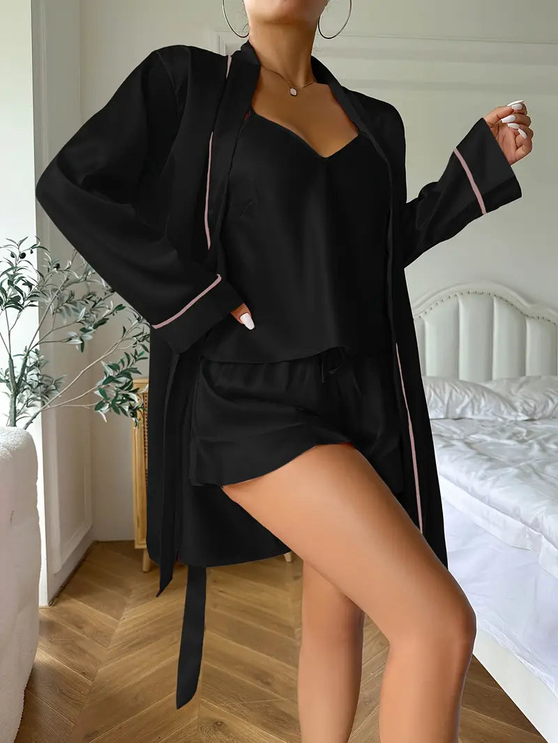 Long Sleeve Belted Robe & pajama - Top & Shorts Sleep set 3pcs, Women's Sleepwear & Loungewear