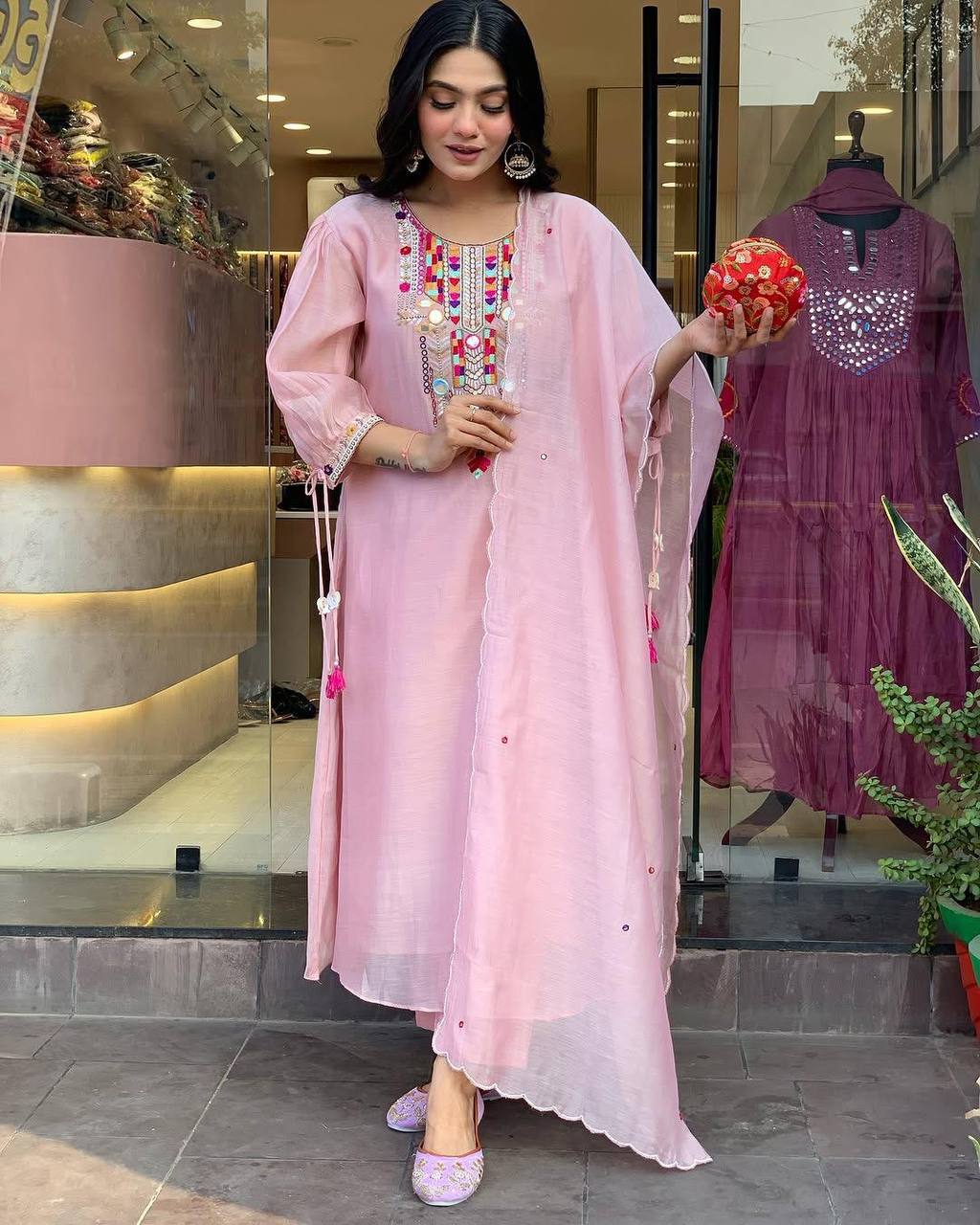 Embroidered Cotton Silk Salwar Kameez Set with Chanderi Dupatta in White-Sky-Pink